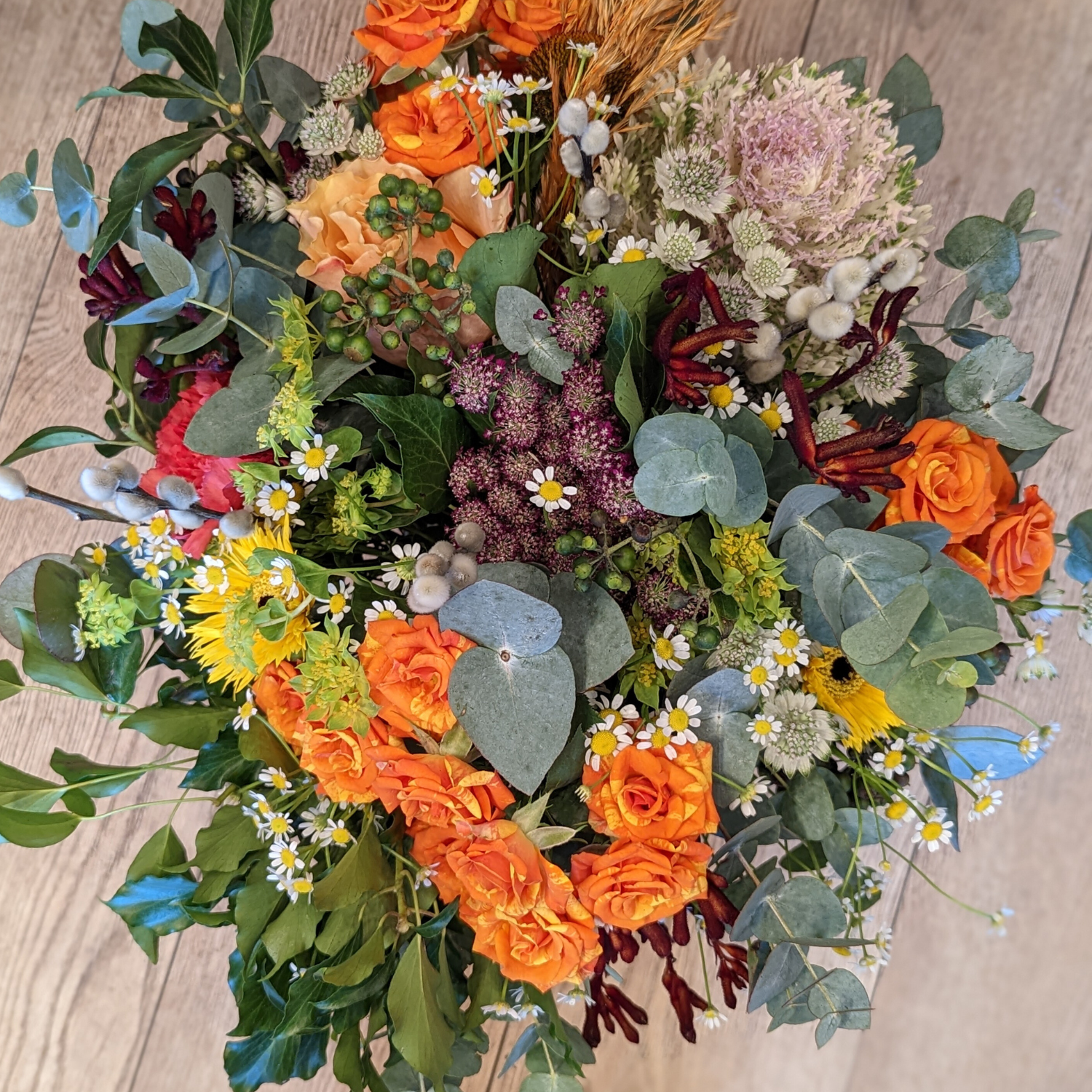Réalisé à la main dans nos ateliers de Saint-Apollinaire, Arc-sur-Tille et Sennecey-lès-Dijon, situés près de Dijon, ce bouquet associe roses et autres fleurs de saison, avec feuillages et touches dorées.