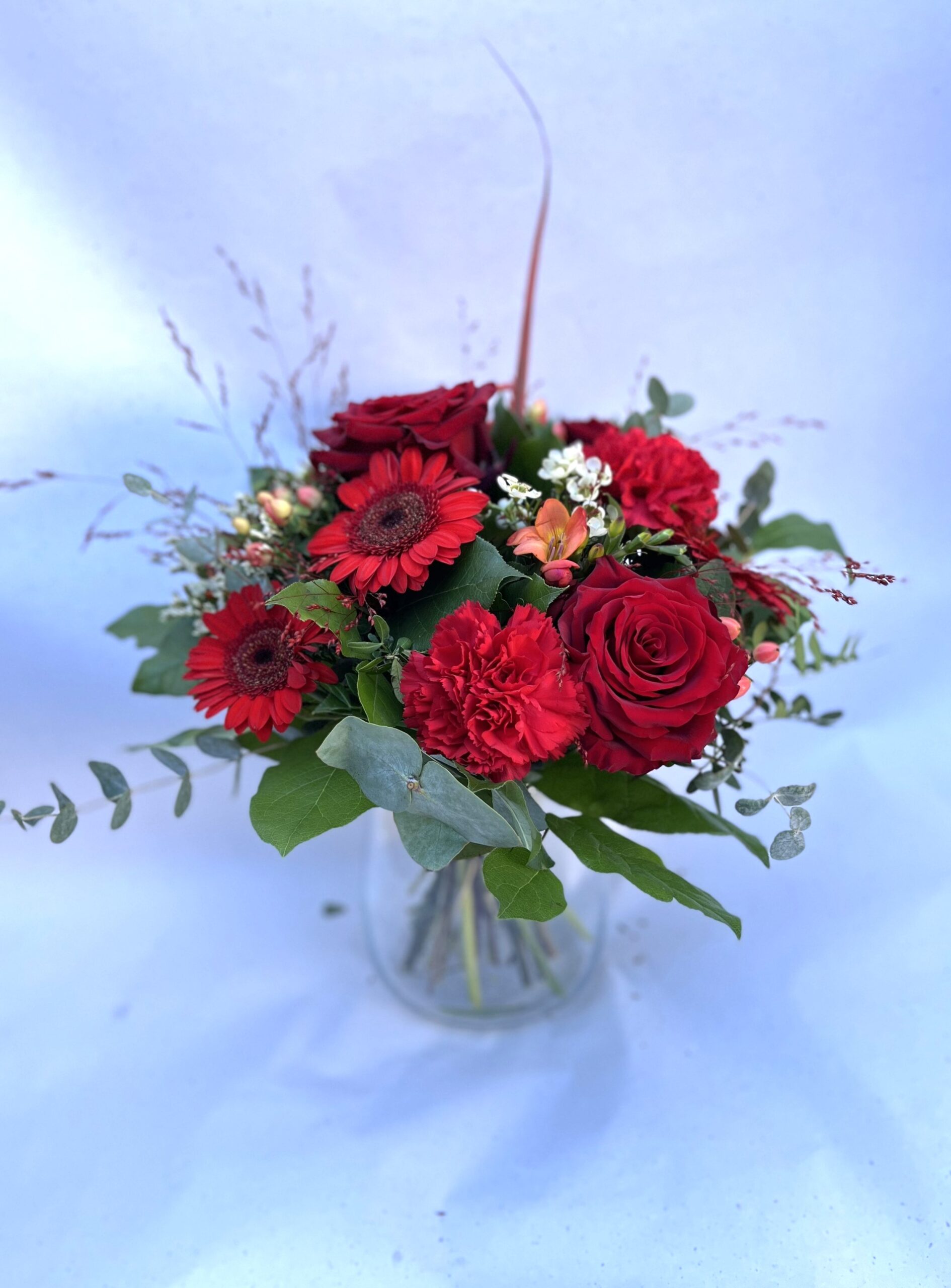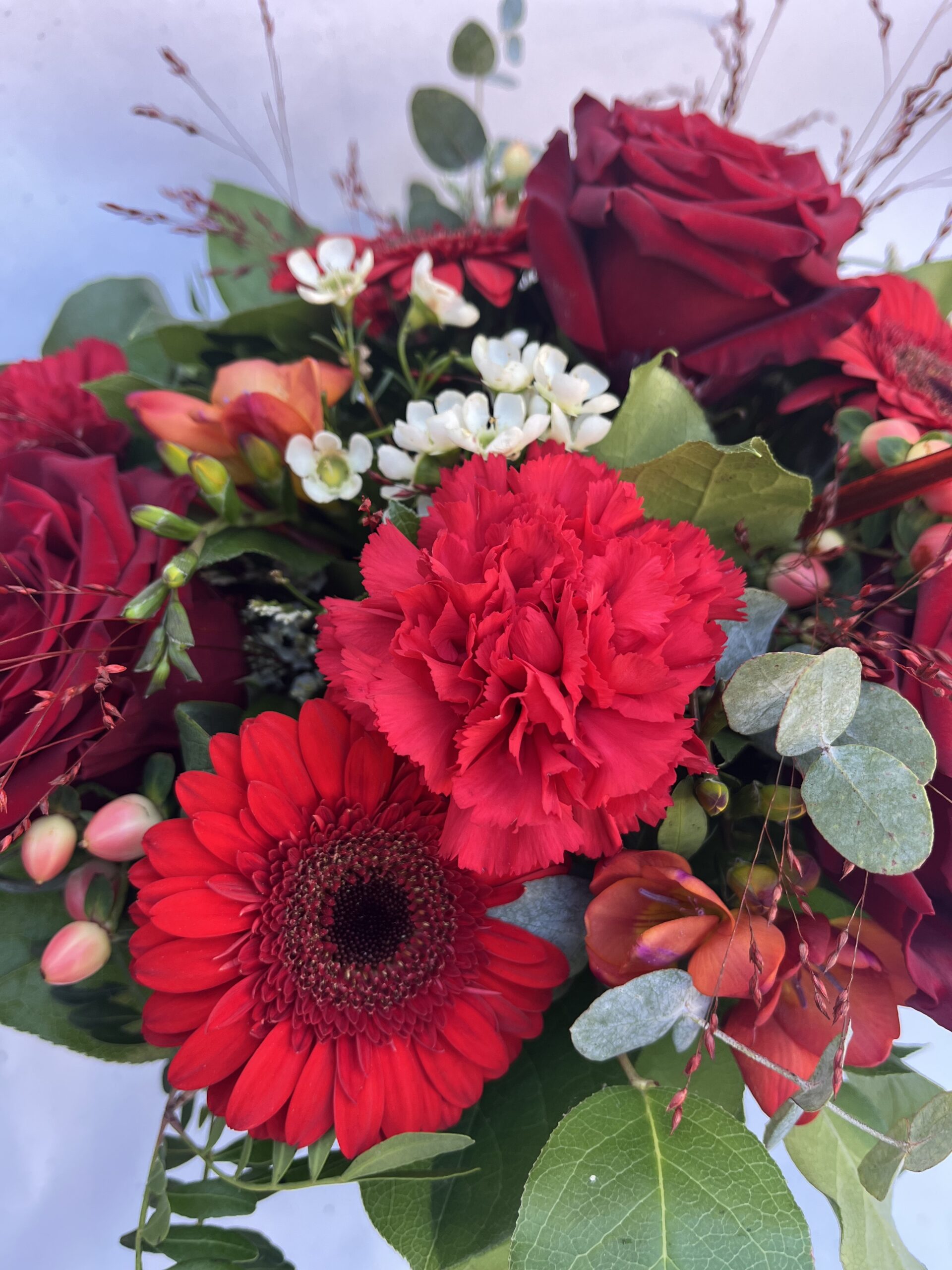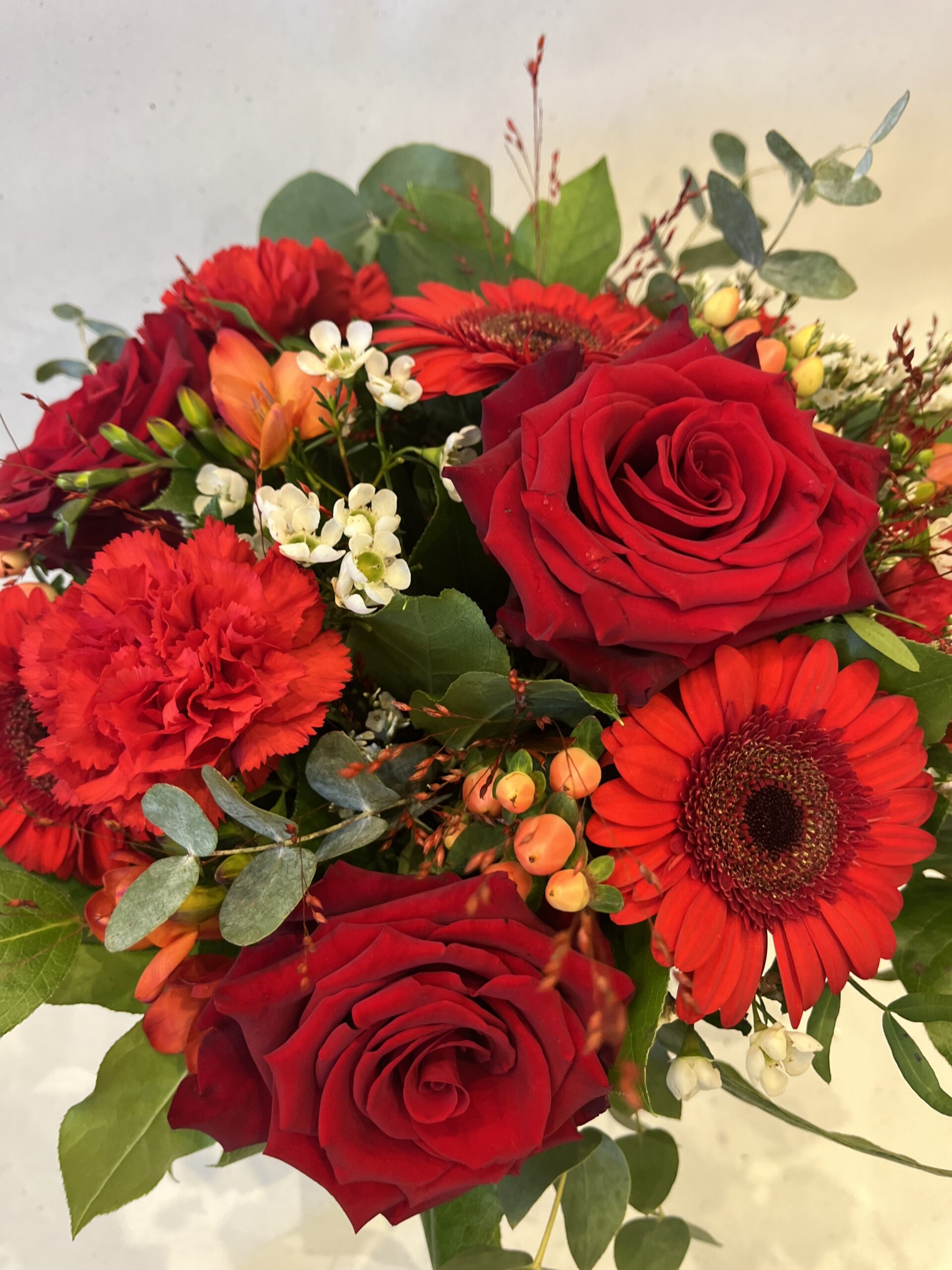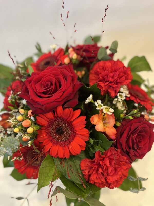 Le Bouquet Rond Rouge de Créa’Flore est une composition florale lumineuse et chaleureuse, composée de teintes rouges.