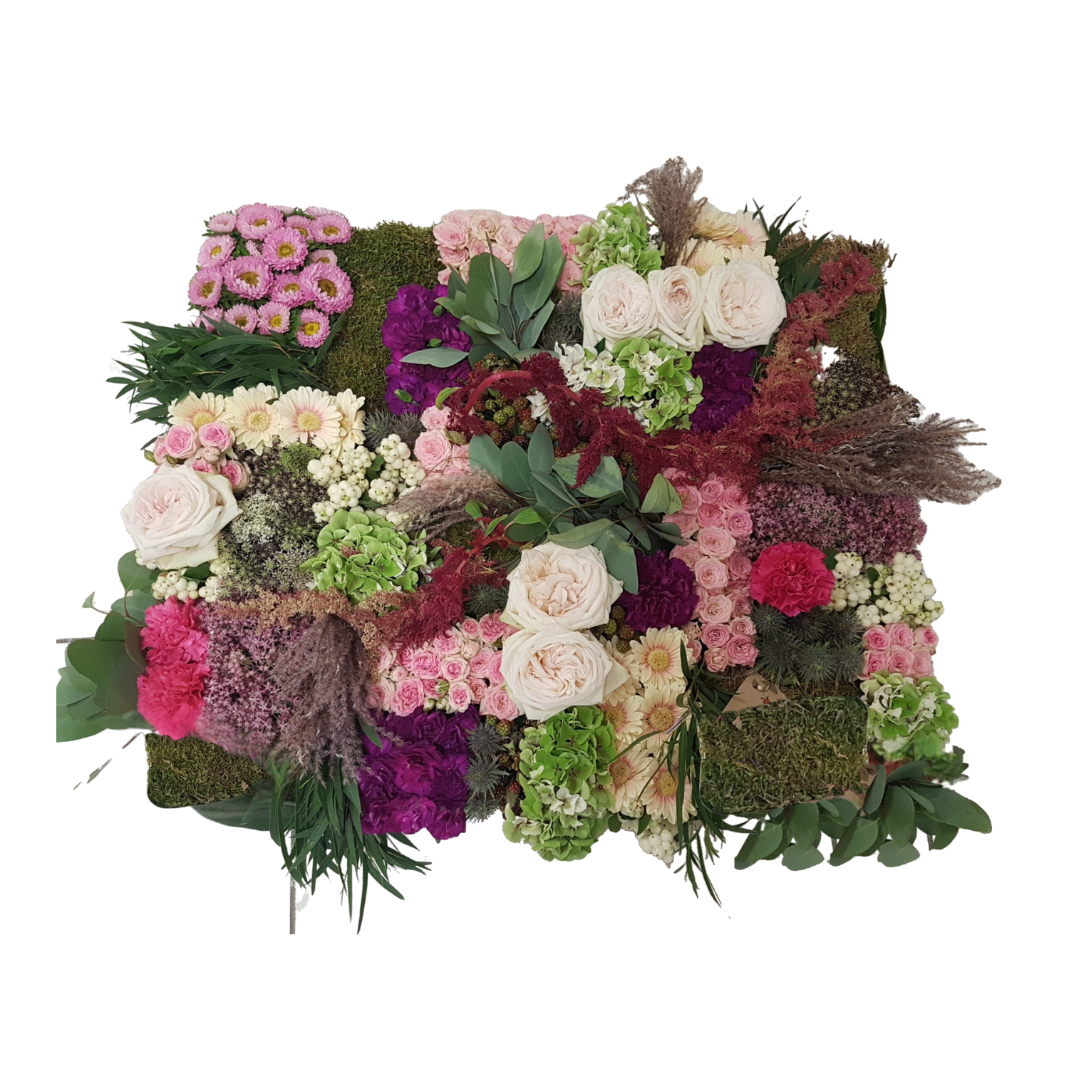 Le Carré Jardin Agate de Créa’Flore est une composition florale raffinée et apaisante, déclinée dans des teintes prune et rose pâle.