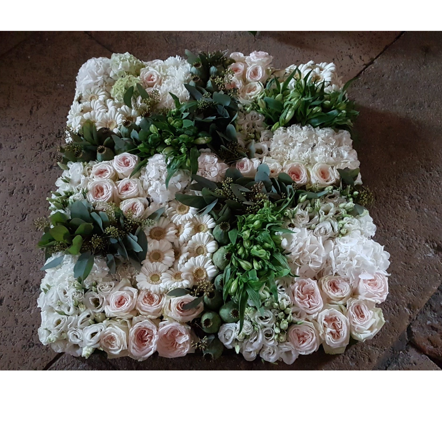 Le Carré Mosaïque Perle de Créa’Flore est une composition florale de deuil raffinée et contemporaine, en hommage lumineux et structuré.