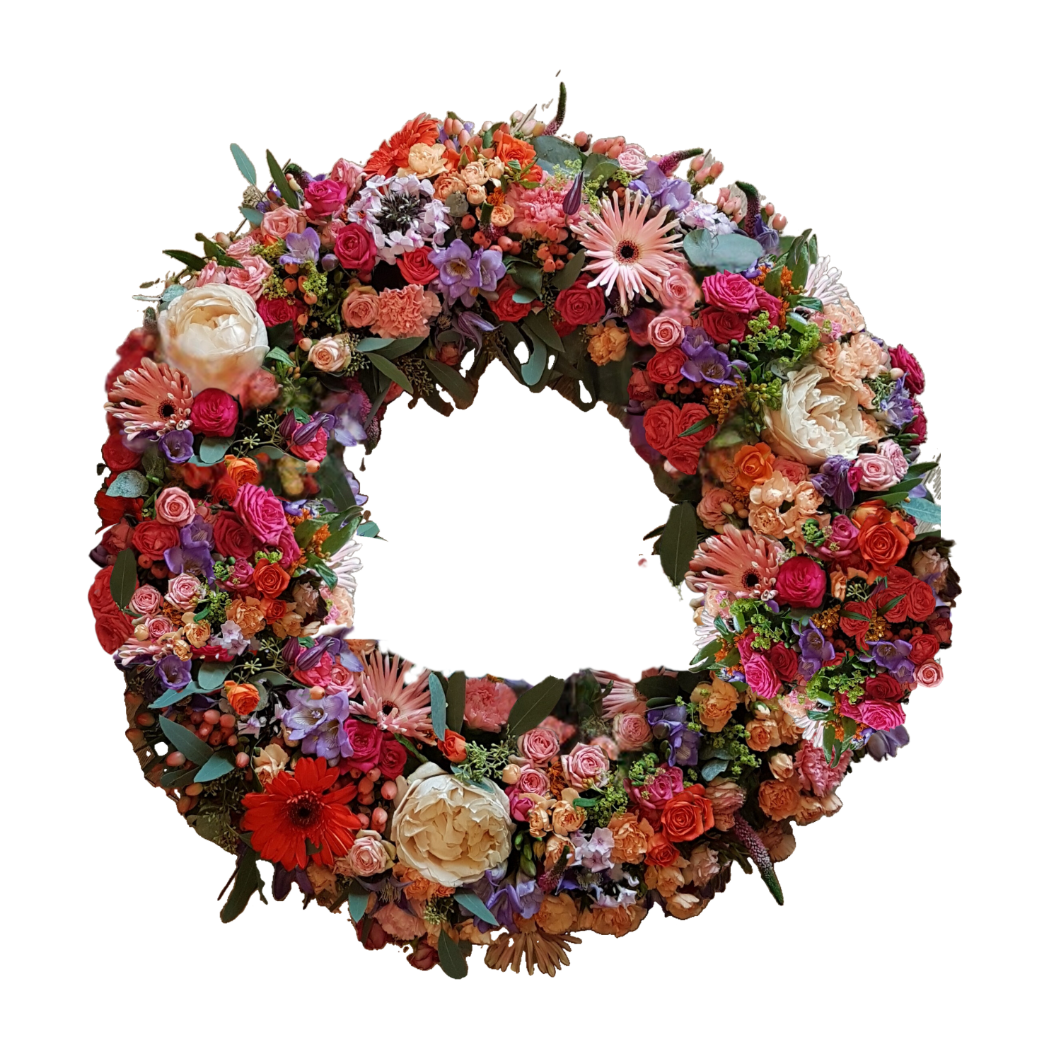 La Couronne Grenat de Créa’Flore est une composition florale de deuil chaleureuse et intense, mêlant des teintes grenat et multicolores pour exprimer un hommage empreint de profondeur.