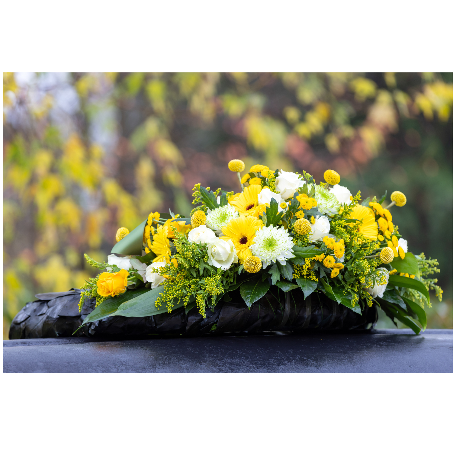 Le Dessus de Cercueil Citrine de Créa’Flore est une composition florale éclatante et apaisante, réalisée dans des teintes jaunes, orangées et dorées.