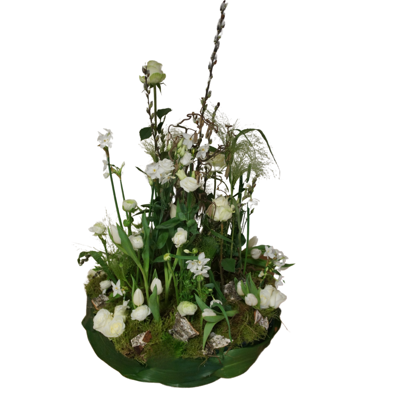 Le Jardin Perle de Créa’Flore est une composition de deuil sobre et lumineuse, aux teintes blanches, pensée pour un hommage empreint de sérénité.